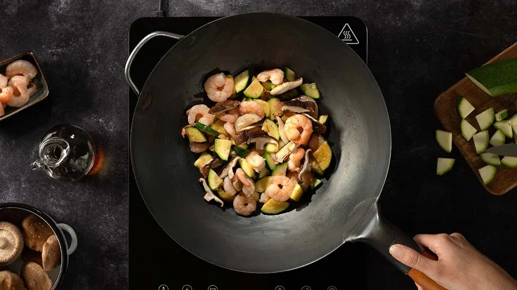 Kuumenna kasviöljy isossa wokkipannussa ja paista kesäkurpitsaa ja sieniä kovalla lämmöllä 2 minuuttia. Lisää jättikatkaravunpyrstöt ja paista vielä 3 minuuttia. Lisää Kikkoman teriyakikastike ja sekoita hetki.
