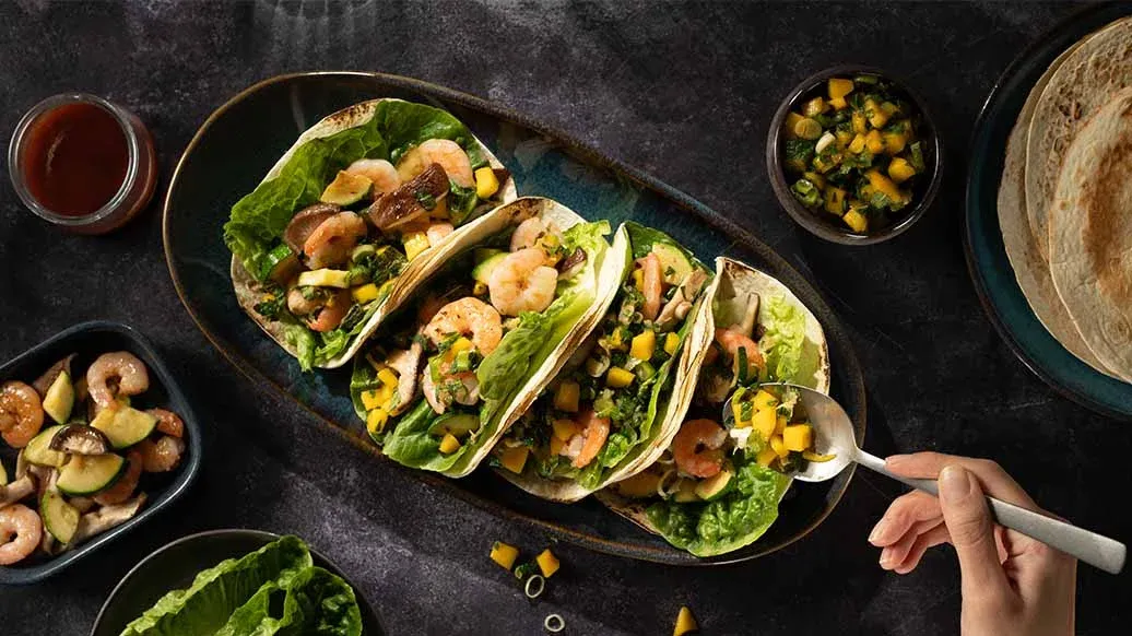 Vuoraa tacokuoret salaatinlehdillä ja täytä Kikkoman chilikastikkeella, mangosalsalla, katkaravuilla ja kasviksilla.
