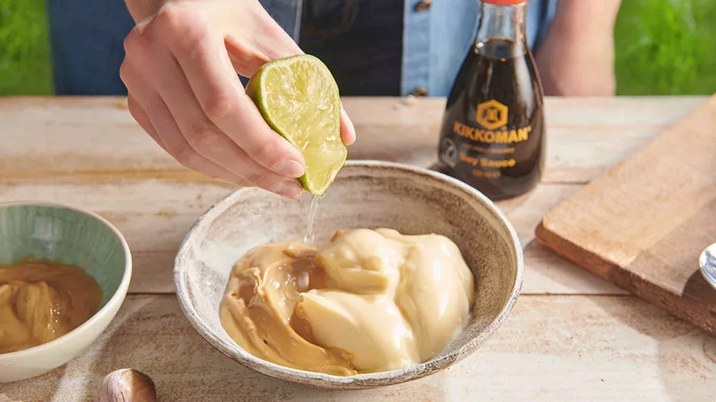 Sekoita majoneesi, maapähkinävoi, limettimehu, Kikkomanin soijakastike ja silputtu chili (valinnainen).