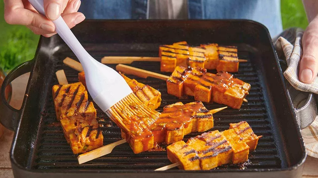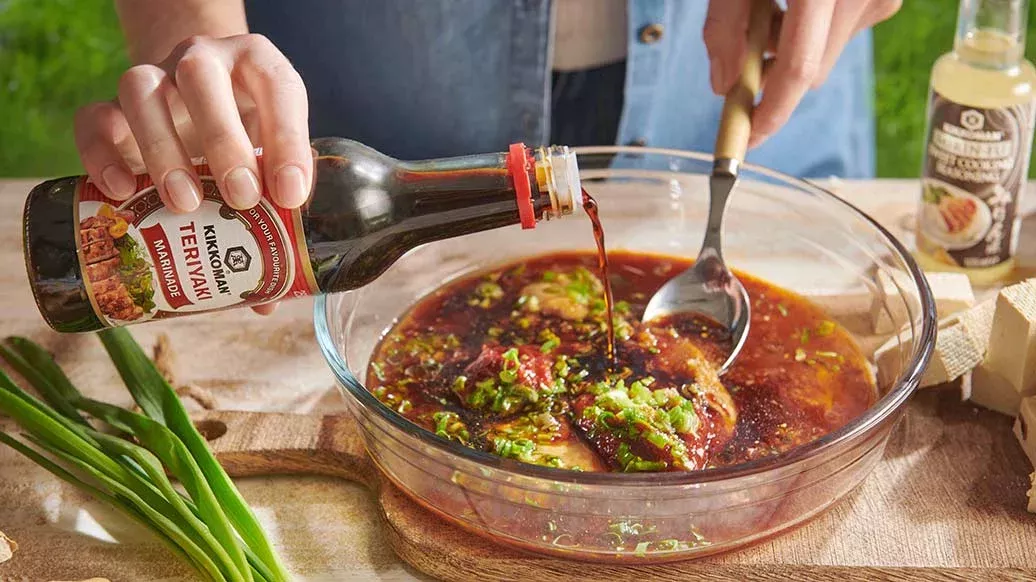 Teriyakikastikkeessa ja seesamiöljyssä marinoidut tofuvartaat tuovat keittiöösi itämaisen tuulahduksen. Marinadin makuja syventävät maapähkinävoi ja Kikkomanin Chilikastike Kimchille. Maapähkinämajoneesi viimeistelee makuelämyksen.