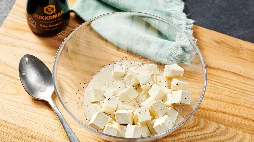 Käytä savustettua tofua vegaanisen fetan sijaan ja marinoi se Kikkoman-soijakastikkeessa.
