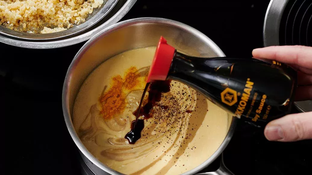 Soseuta kastiketta varten 150 g kikherneitä sitruunankuoren kanssa, mausta sitruunanmehulla ja kookosmaidolla, kuumenna, lisää tahini, Kikkomanin soijakastike , pippuri ja kurkuma.