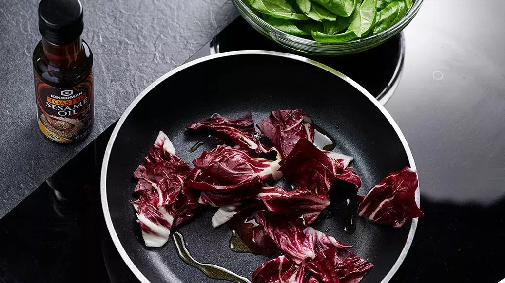 Valmista bulgur pakkauksen ohjeen mukaan. Suikaloi mangoldi ja paista 1 teelusikallisessa kuumennettua Kikkomanin paahdettu seesamiöljy. Toista pinaatin kanssa.