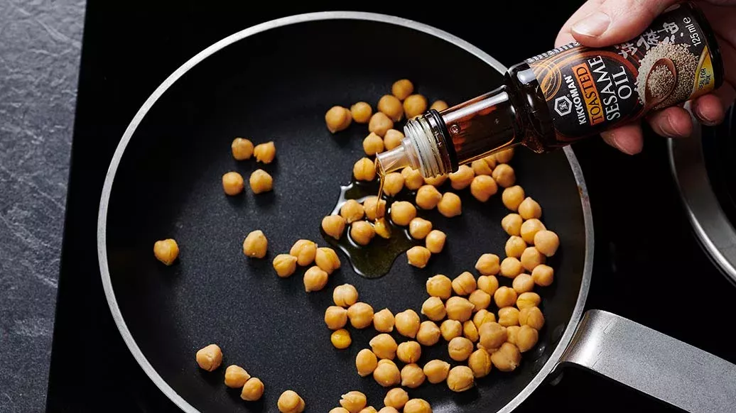 Paista jäljellä olevat kikherneet 1 teelusikallisessa kuumennettua Kikkomanin paahdettu seesamiöljy noin 2 minuutin ajan.