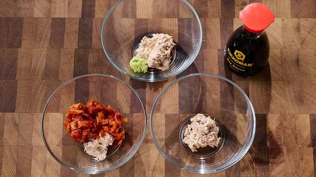Valuta tonnikala ja sekoita se Kikkomanin soijakastikkeen sekä majoneesin kanssa. Laita yhteen kulhoon 10 g tonnikalaseosta ja silputtu kimchi. Laita toiseen kulhoon 20 g tonnikalaseosta ja wasabi. Laita loput 30 g tonnikalaseosta kolmanteen kulhoon.
