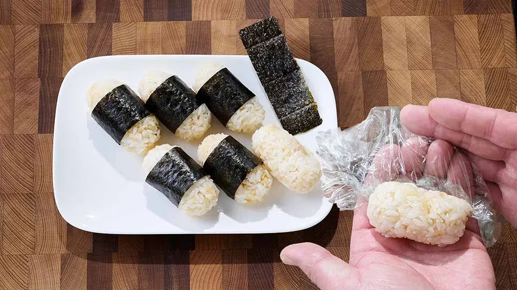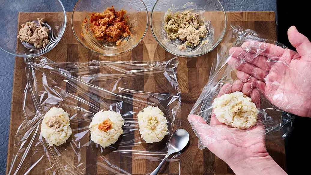 Jaa riisi kuuteen osaan, kukin n. 60 g. Muotoile riisi litteäksi kiekoksi, aseta tuorekelmun päälle ja laita n. 2 tl yhtä tonnikalatäytettä kiekon keskelle. Muotoile varovasti käsin rullaksi. Tee jokaisesta täytteestä kaksi rullaa ja poista tuorekelmu.