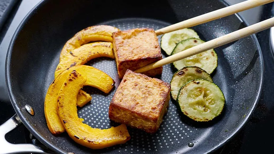 3 rkl auringonkukkaöljyä – 4 viipaletta 0,5–1 cm paksuja – 4 ohutta kurpitsansiivua – 200 g tofua – 2 rkl Kikkoman luonnollisesti valmistettu soijakastike – 2 rkl Kikkoman Mirin-tyylinen makea ruuanvalmistuskastike – 30 g vehnäjauhoja