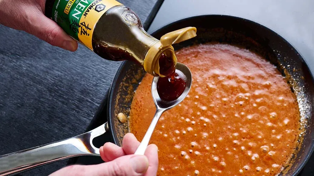 Silppua punasipuli sekä valkosipuli ja kuullota niitä oliiviöljyssä pienessä kattilassa alhaisella lämmöllä. Lisää tomaattikastike, soijamaito, 100 ml vettä sekä Kikkoman ramen-liemipohja. Keitä minuutin verran ja ota kattila pois liedeltä. Sekoita joukkoon chilijauhe ja annostele liemi kahteen kulhoon.