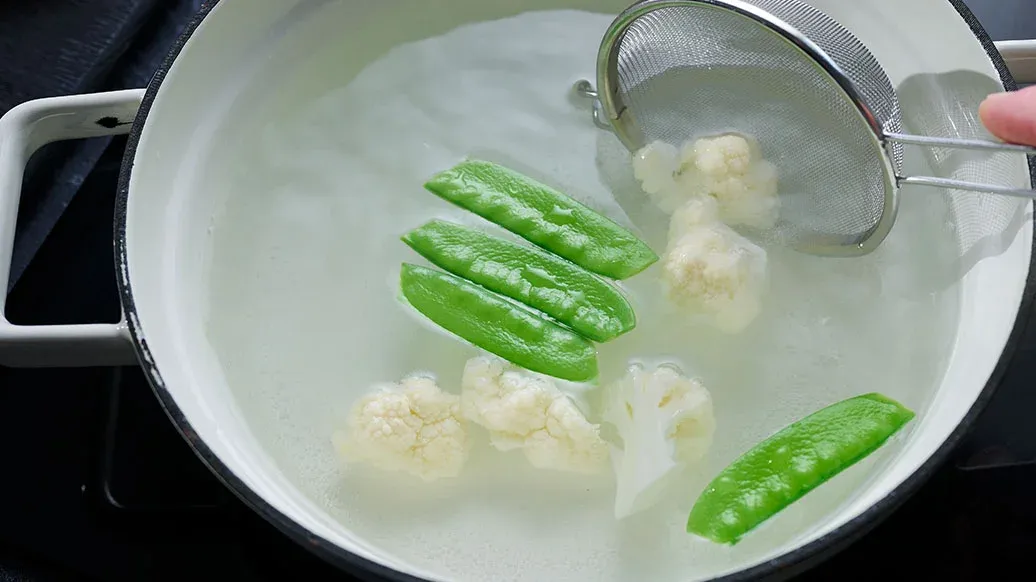 Ryöppää kukkakaalin kukintoja ja edamame-papuja suolatussa kiehuvassa vedessä n. 3 minuuttia. Pese sokeriherneenpalot, keitä minuutin verran ja huuhtele sitten kylmällä vedellä.
