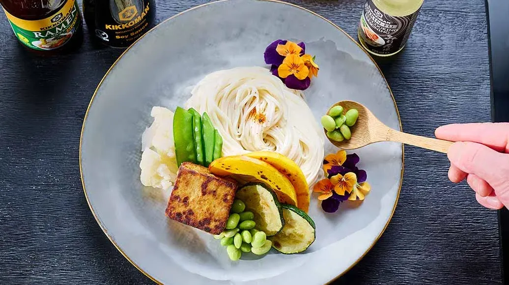 Vegaanisen tsukemenin eli japanilaisten dippinuudelien kanssa tarjoillaan runsaasti tuoreita kasviksia. Täyteläinen tomaattikastike maistuu kirpeän raikkaalta, ja voit säädellä sen tulisuutta mielesi mukaan.