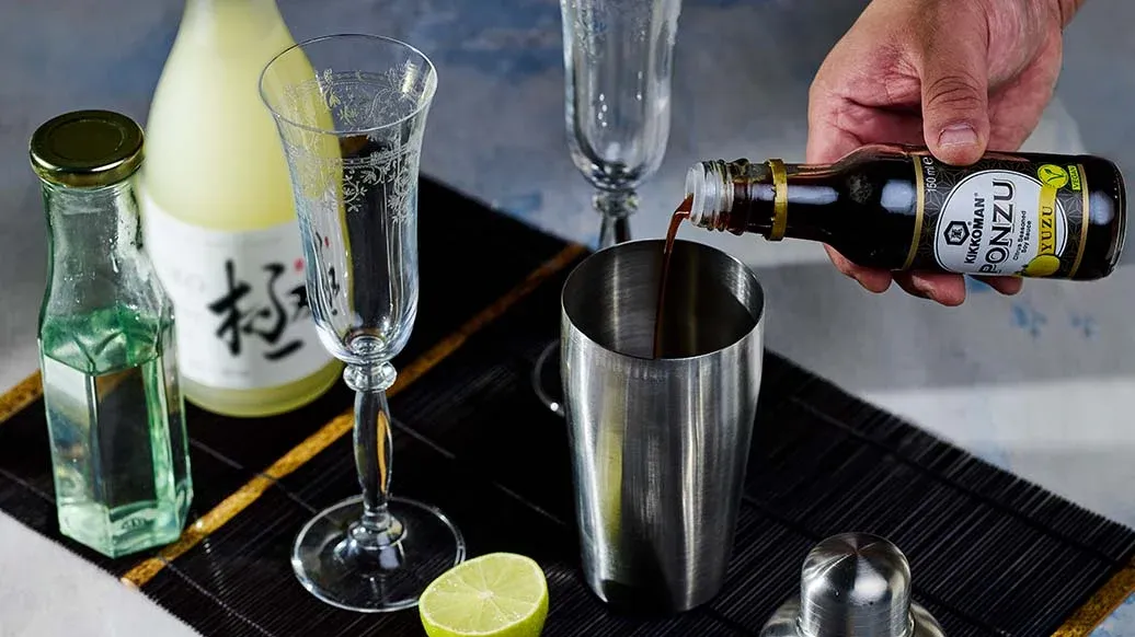 2 cocktailshakeria – 16 jääpalaa (n. 20 g/kpl) – 100 ml yuzu sakea – 60 ml limettimehua – 40 ml sokerisiirappia – 2 lorausta Kikkoman Ponzu - sekoitus soijakastiketta, etikkaa ja yuzu-hedelmätäysmehua